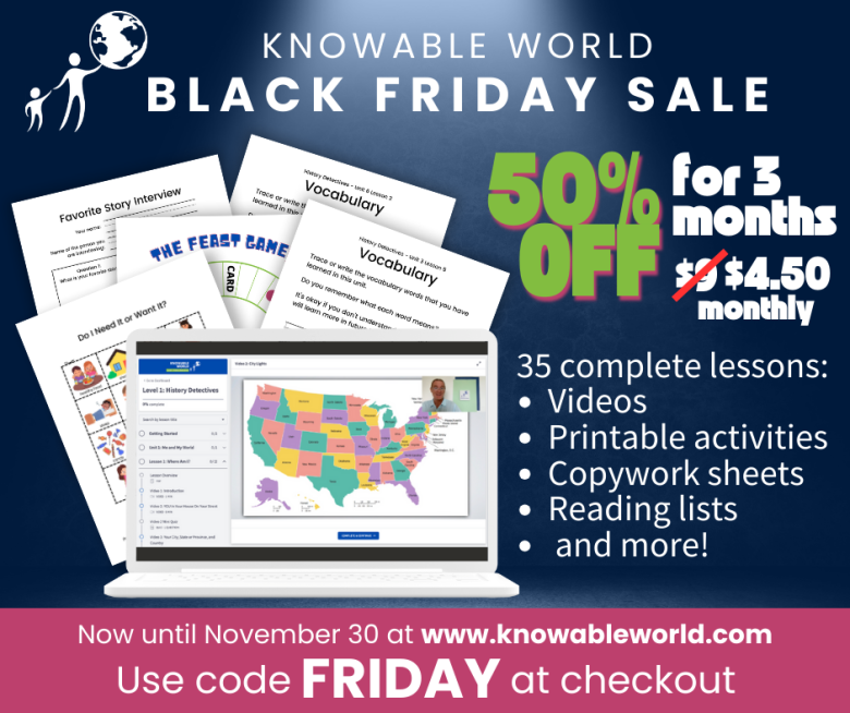 K-2 Homeschool History Get 50% off for 3 months. ($4.50 instead of $9)! 35 complete lessons including videos, printable activities, copywork sheets, reading lists and more! Vaild now through November 30th, sign up with the code FRIDAY here!