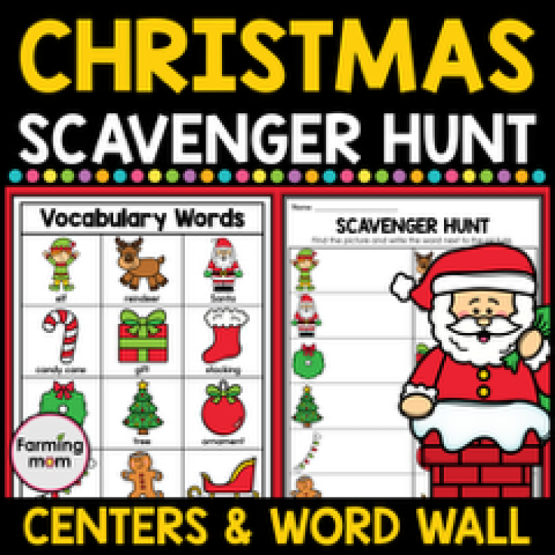 Christmas Scavenger Hunt Activity $1 Students have a blast with these write the room Christmas activities as they go on a scavenger hunt to search and find the vocabulary words at your Christmas party or December literacy centers. The vocabulary activities include Christmas word cards and posters to hang on your word wall, bulletin board, or around your classroom.